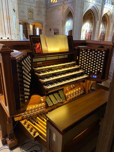The new organ is an impressive instrument of 111 speaking stops spread over a handsome four-manual console. It was built by the Rodgers Instrument Corporation, Hillsboro, Oregon which successfully combined new pipe work with digitally sampled pipe voices and the best of the surviving pipes and parts from the former organ. Based on Rodgers highly advanced computer networking system, Parallel digital Imaging technology, the digital technology and the wind driven pipes have created the largest new instrument of its kind ever built.
